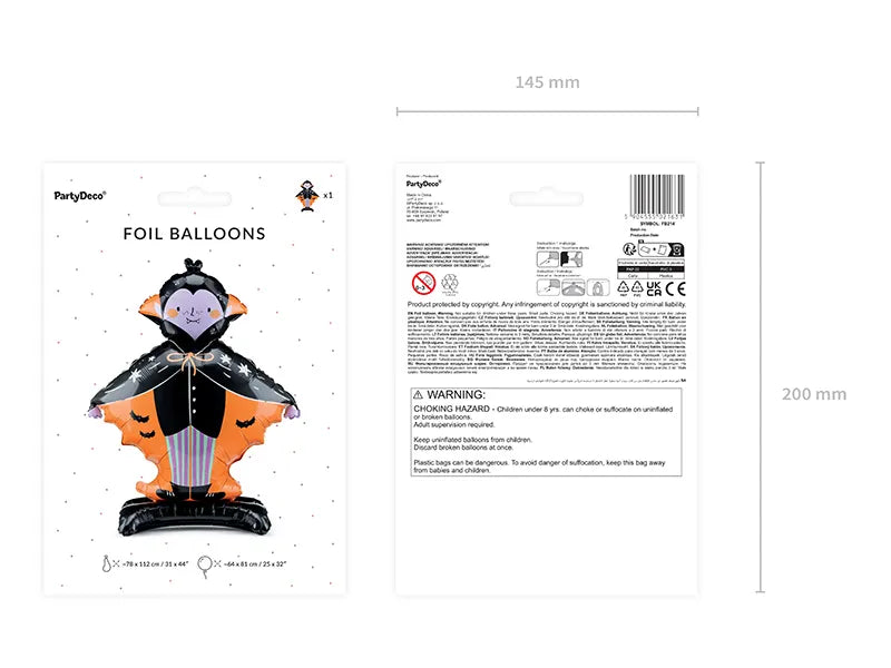 Stylový Drákula okamžitě vykouzlí „spooky“ atmosféru – stojí sám o sobě, takže se skvěle hodí k vstupu, do fotokoutku i vedle party stolu. Nafukuje se pouze vzduchem a slámka je součástí balení. (Helium není vhodné, balónek se nebude vznášet.)