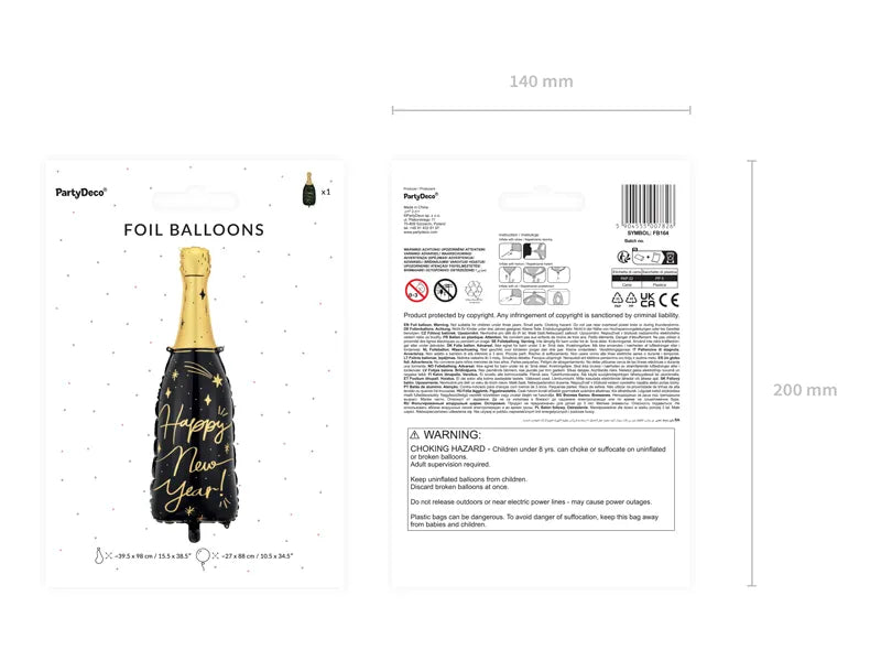 Elegantní balónek ve tvaru stylové šampaňské-láhve s nápisem „Happy New Year“ — ideální dekorace na silvestrovské oslavy, novoroční party, narozeninové večírky i glam-události. Po nafouknutí balónek působí jako velká luxusní dekorace a skvěle doplní novoroční stolování, fotokoutek nebo vstupní prostor. Díky fóliovému provedení a možnosti nafouknutí heliem nebo vzduchem ho snadno umístíte — zavěsit, připevnit nebo nechat volně viset.