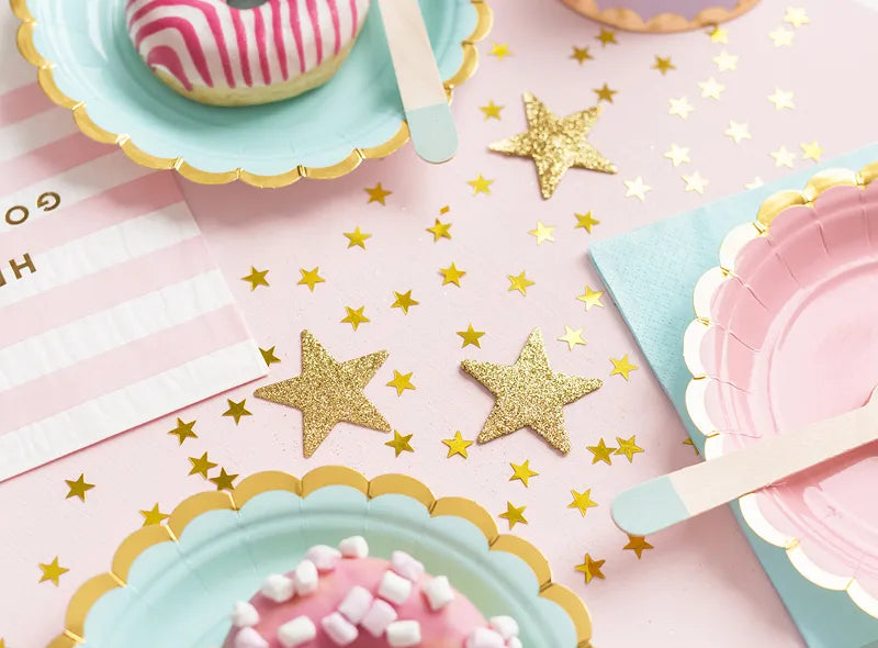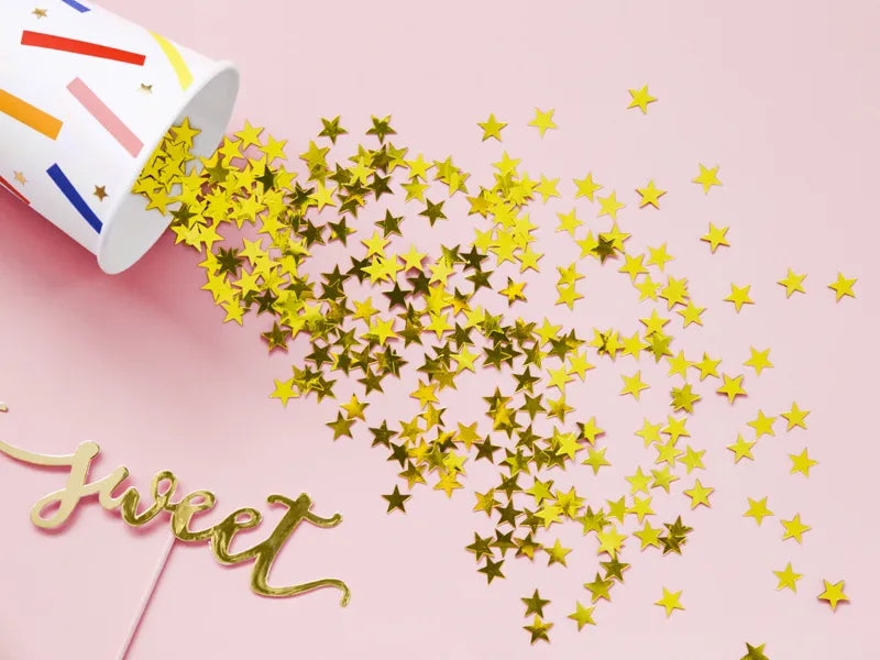 Lesklé konfety ve tvaru drobných zlatých hvězdiček přinesou vaší oslavě špetku třpytu a slavnostní atmosféry. Jsou ideální ke stolu, na party, k narozeninám, na Vánoce nebo silvestrovské oslavy — vypadají skvěle rozhozené po stole, nebo jako doplněk na focení. Konfety jsou vyrobené z fólie s metalickým leskem, díky čemuž při světle krásně odrážejí a dodávají prostoru jiskru.