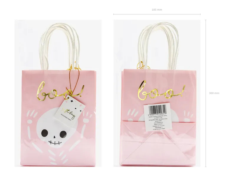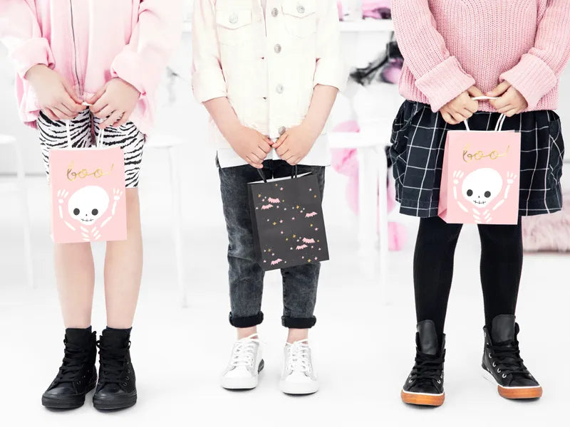 Růžové dárkové tašky s bílým, černým a zlatým potiskem „Boo“ — rozzáří každý dárek na Halloweenu i tematické party.