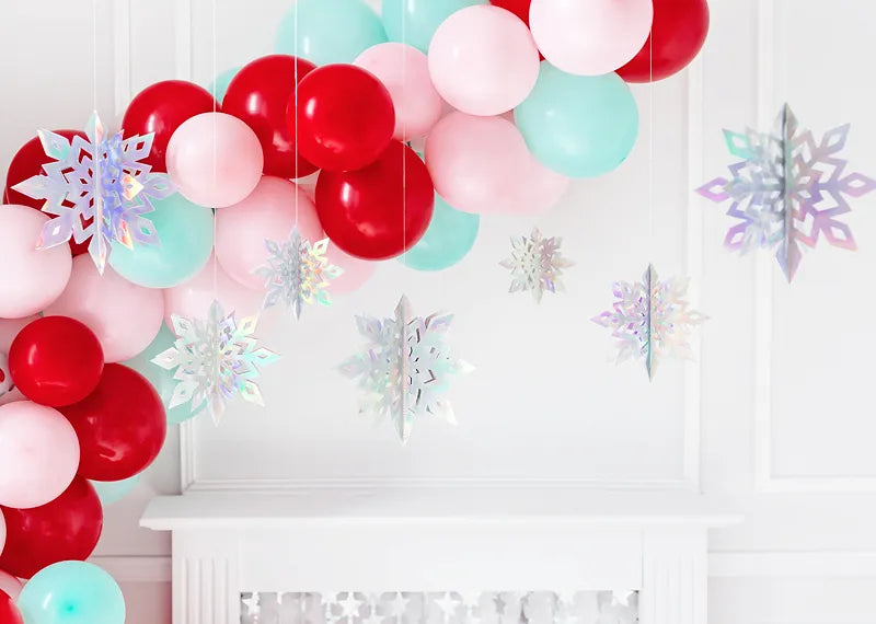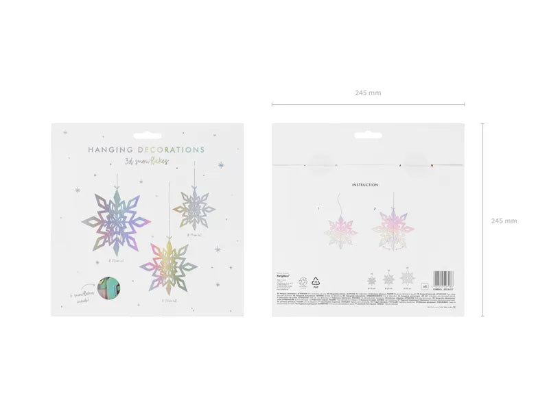 Romantická a elegantní sada 6 ks papírových závěsných dekorací ve tvaru vloček — perfektní doplněk k vánoční výzdobě, zimním oslavám nebo svátečnímu interiéru. Vločky mají jemný holografický povrch, který při osvětlení jemně třpytí a dodává prostoru kouzelnou atmosféru.